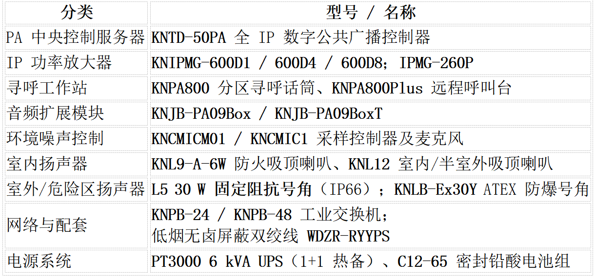 防爆 & 室外覆盖:组合 KNLB-Ex30Y ATEX 防爆喇叭与 L5 30 W 固定阻抗防水号角,针对罐区、火炬区等危险场所实现 360° 无死角广播