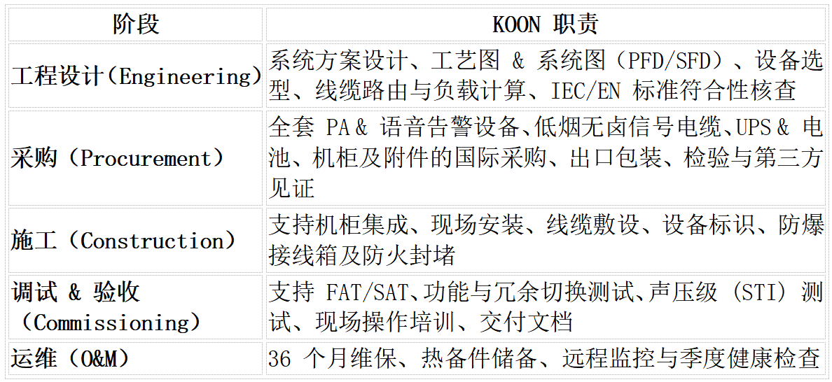 科威特油田扩建工程是科威特国家石油公司(KOC)的关键上游投资,旨在提升原油日处理能力并完善现场安全通信体系。业主要求公共广播 (PA) 与紧急通信系统须满足 EN 54-16 / ISO 7240-16 等国际安全标准,在高温、多粉尘、易燃易爆的环境下实现 7 × 24 小时 无间断运行。HONGKONG KOON TECHNOLOGY LIMITED 受邀以 EPC 承包商 联合体身份,为项目提供从设计、供货、集成、调试到维保的全生命周期服务。
